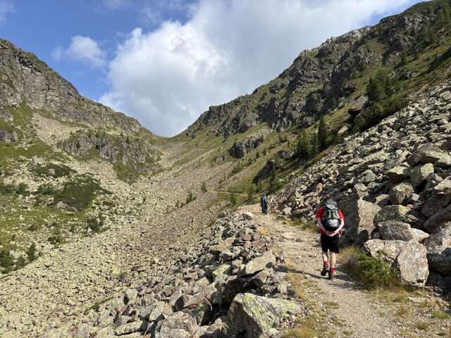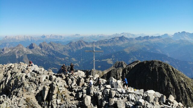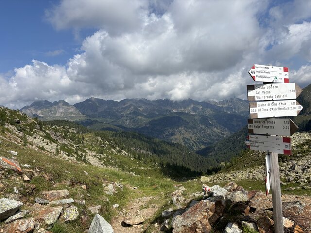 Vanuit Malga Sorgazza volg je het geasfalteerde pad 327. Bij de splitsing met pad 380 heb je de keuze: verder omhoog lopen via pad 327 richting Rifugio Brentari of via pad 380 naar de klettersteig Giulio Gabrielle. Wij kozen voor de via ferrata die uit 2 korte delen bestaat en die redelijk eenvoudig is. Bij Passo Scocede (2566 meter) daal je vervolgens af richting Lago Cima d'Asta, dat zich aan de voet van de honderden meters hoge bergwand van de gelijknamige top bevindt. Rifugio Ottone Brentari is vervolgens de overnachtingsplek. Op dag 2 gaat het vanuit de berghut direct omhoog naar La Forzeleta (2680 meter), vervolgens kort omlaag en dan uiteindelijk naar de top van Cima d'Asta (2.847 meter). Vanaf hier heb je een fantastisch uitzicht op de Lagorai en Dolomieten. Bij helder weer zijn zelfs de besneeuwde toppen in Oostenrijk en Zwitserland waar te nemen! Dezelfde weg wordt teruggelopen tot aan Rifugio Brentari. Daar heb je vervolgens de keuze om via pad 327 of 386 terug te keren naar Malga Sorgazza, waarbij de laatste optie ca. 1,5 uur langer zal duren. | |